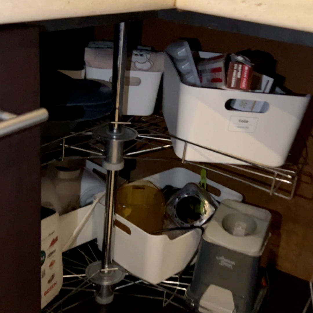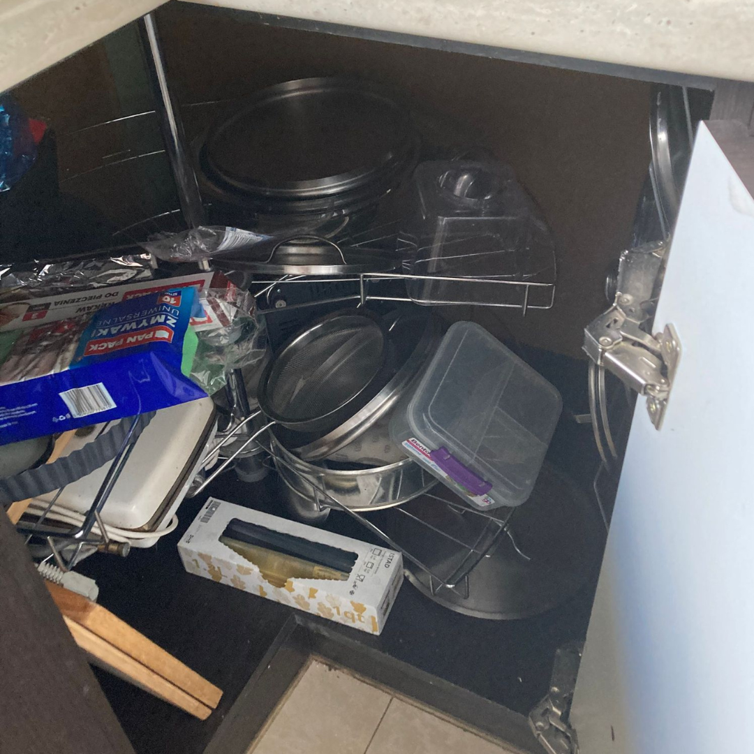 Podczas wspólnego ogarniania okazało się, że miała mnóstwo przeterminowanych zapasów (przyprawy z terminem sprzed 15 lat, przetwory sprzed 9 lat, puszki przeterminowane 6 lat temu) oraz zepsutych sprzętów i zbędnych naczyń (kapsułkowy ekspres do kawy, 2 miksery, 4 patelnie, 5 garnków, 8 pojemników bez pokrywek, 15 pokrywek bez pojemników, 3 deski do krojenia, 12 misek kamionkowych, 7 łyżek do gotowania), które od lat zawalały jej kuchnię. Dodatkowo układ rzeczy w szafkach był niezaplanowany i tylko potęgował bałagan.
