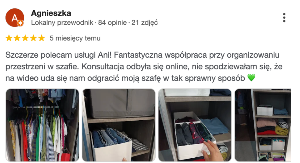 W czasie 2-godzinnej konsultacji online razem uporządkowałyśmy całą szafę. Wybrałyśmy ubrania, w których Aga czuje się dobrze, posegregowałyśmy te sezonowe, na sprzedaż, do oddania i naprawy.