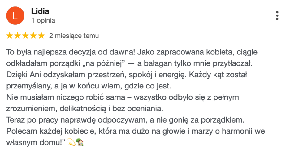 Oto, co mówi: „To była najlepsza decyzja od dawna! Dzięki Ani odzyskałam przestrzeń, spokój i energię. Każdy kąt został przemyślany, a ja w końcu wiem, gdzie co jest.”